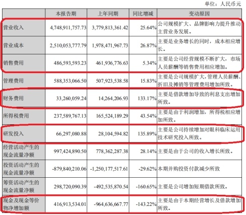 截至2019年上半年末,爱尔眼科营业成本25.10亿元,同比增加26.87%,主要原因是业务增长的同时,成本相应增长;销售费用4.87亿元,同比增长5.34%,主要原因是公司经营规模不断扩大,市场人员薪酬等销售费用相应增加;财务费用3326.01万元,增长133.17%,主要原因是借款增加导致的利息支出增加;研发投入6629.71万元,同比增长135.89%,主要原因是公司持续增加对眼科临床运用技术研究投入;现金及现金等价物净增加额4.17亿元,同比减少143.22%,主要原因是本期经营增长及借款增加。
