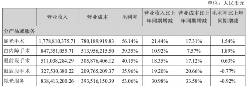 截至2019年上半年末,爱尔眼科主要产品(服务)屈光手术实现营业收入17.79亿元,营业成本7.80亿元,毛利率56.14%,毛利率同比增加1.54%;白内障手术实现营业收入8.47亿元,营业成本5.14亿元,毛利率39.35%,毛利率同比增加1.89%;眼前段手术实现营业收入5.11亿元,营业成本3.06亿元,毛利率40.15%,毛利率同比增加0.63%;眼后段手术实现营业收入3.28亿元,营业成本2.10亿元,毛利率35.96%,毛利率同比下降0.77%;视光服务实现营业收入8.38亿元,营业成本3.94亿元,毛利率53.06%,毛利率同比下降0.92%。