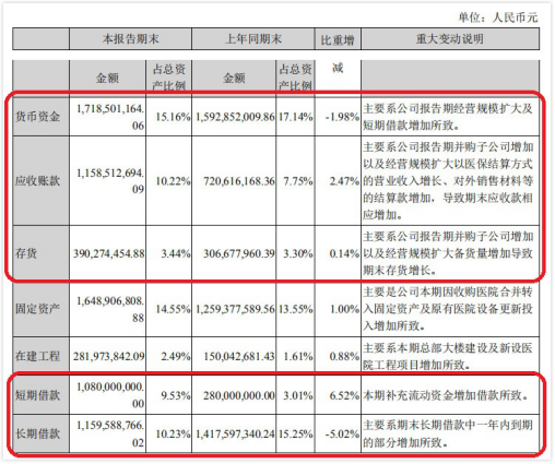 截至2019年上半年末,爱尔眼科货币资金17.19亿元,占总资产比例为15.16%,比重下降1.98%,爱尔眼科称主要系公司报告期经营规模扩大及短期借款增加所致。应收账款11.59亿元,占总资产比例为10.22%,比重增长2.47%,爱尔眼科称主要系公司报告期并购子公司增加以及经营规模扩大以医保结算方式的营业收入增长、对外销售材料等的结算款增加,导致期末应收款相应增加。存货3.90亿元,占总资产比例为3.44%,比重增长0.14%,爱尔眼科称主要系公司报告期并购子公司增加以及经营规模扩大备货量增加导致期末存货增长。短期借款10.80亿元,占总资产比例为9.53%,比重增长6.52%,爱尔眼科称主要系本期补充流动资金增加借款所致。长期借款11.60亿元,占总资产比例为10.23%,比重下降5.02%,爱尔眼科称主要系期末长期借款中一年内到期的部分增加所致。