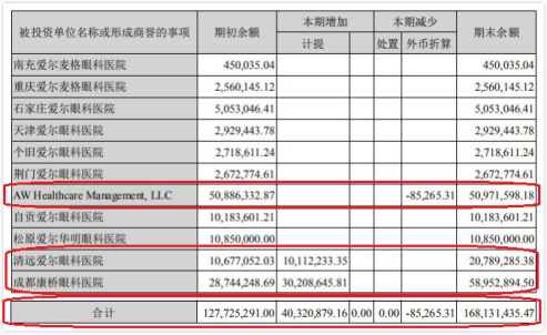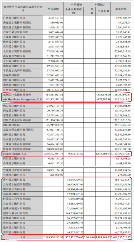 爱尔眼科商誉账面原值合计26.08亿元,期初余额为21.89亿元。报告期内,通过企业合并新增商誉账面原值4.22亿元,通过外币折算减少的商誉账面原值348.88万元。其中,亚洲医疗集团有限公司通过外币折算减少商誉账面原值-65.49万元;AW Healthcare Management, LLC通过外币折算减少商誉账面原值-17.25万元;Clínica Baviera. S.A通过外币折算减少商誉账面原值431.62万元,通过企业合并新增商誉账面原值933.42万元;另外,还有包括晋中爱尔眼科医院、上海爱尔睛亮眼科医院等12家新增被投资医院为爱尔眼科增加了通过企业合并提高的商誉账面原值。