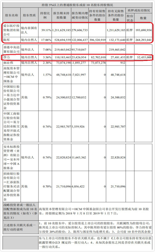 报告期内爱尔眼科股东质押也较多。截至2019年上半年末,爱尔眼科的主要股东爱尔医疗投资集团有限公司、陈邦和进行了股份质押。3家股东合计质押4.84亿股,占总股本的15.96%。