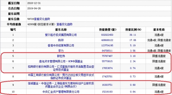 爱尔眼科第五大股东郭宏伟持股量由7576.75万股减少至7387.42万股,经资本公积转增股本后减持2462.35万股,持股比例由3.18%下降至2.38%。爱尔眼科第六大股东高瓴资本管理有限公司-HCM中国基金持股量由5577.06万股减少至4874.86万股,经资本公积转增股本后减持2375.32万股,持股比例由2.34%下降至1.57%。招商银行股份有限公司-汇添富医疗服务灵活配置混合型证券投资基金持股量由1765.37万股增加至2171.01万股,经资本公积转增股本后减持123.97万股,持股比例由0.74%下降至0.7%,从第七大股东滑落至第十大股东。