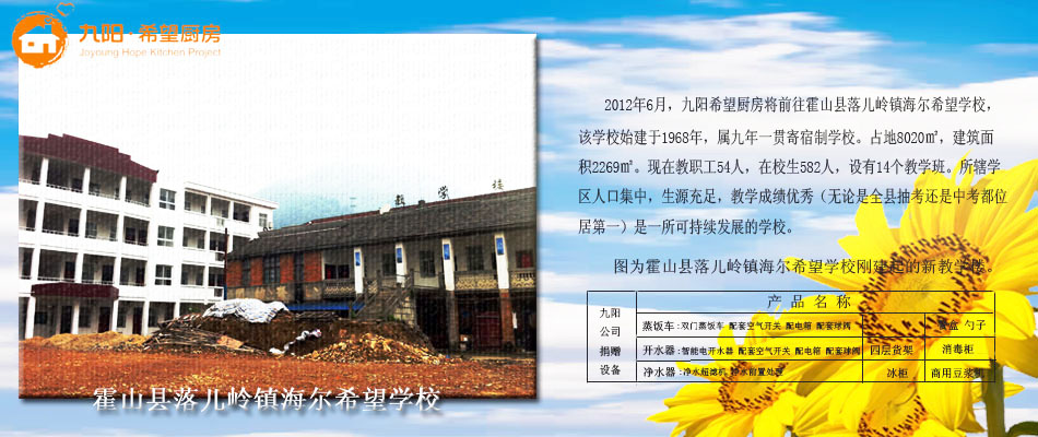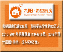 6月26日,霍山县落儿岭中心学校“环球网—九阳希望厨房”落成,九阳股份有限公司宣布,9月底之前将在安徽完成至少9所希望厨房的捐建。到今年年底,安徽全省将有近50所希望厨房投入使用。